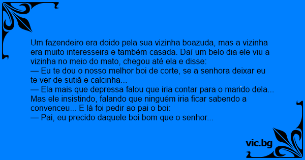 Um fazendeiro era doido pela sua vizinha boazuda, mas a vizinha era muito interesseira e também casada. Daí um belo dia ele viu a vizinha no meio do mato, chegou até ela e disse: