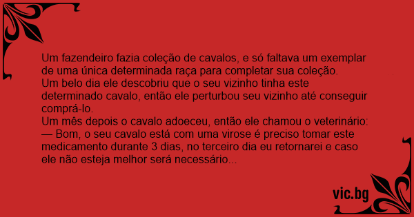 — Bom, o seu cavalo está com uma virose é preciso tomar este medicamento durante 3 dias, no terceiro dia eu retornarei e caso ele não esteja melhor será necessário sacrificá-lo.