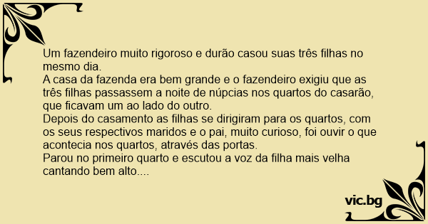 Depois do casamento as filhas se dirigiram para os quartos, com os seus respectivos maridos e o pai, muito curioso, foi ouvir o que acontecia nos quartos, através das portas.