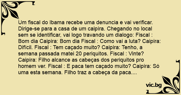 Um fiscal do Ibama recebe uma denuncia e vai verificar. Dirige-se para a casa de um caipira. Chegando no local sem se identificar, vai logo travando um dialogo: Fiscal : Bom dia Caipira: Bom dia Fiscal : Como vai a luta? Caipira: Difícil. Fiscal : Tem caçado muito? Caipira: Tenho, a semana passada matei 20 periquitos. Fiscal : Vinte? Caipira: Filho alcance as cabeças dos periquitos pro homem ver. Fiscal : E paca tem caçado muito? Caipira: Só uma esta semana. Filho traz a cabeça da paca. Fiscal : E outros animais silvestres, tem caçado muito? Caipira: Vários deles. Filho traz as cabeças dos outros bichos pro homem ver. Fiscal : Pensou, pensou e perguntou: Não tem passado por aqui nenhum fiscal do Ibama? Caipira: Sim. Na semana passada. Filho traz a cabeça do fiscal para o homem ver. Fiscal : Até outro dia, obrigado pela atenção. Caipira: Não tem de quê. Volte sempre.