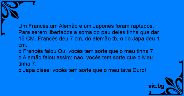 Um Francês,um Alemão e um Japonês foram raptados. Para serem libertados a soma do раu deles tinha que dar 15 CM. Francês deu 7 cm, do alemão tb, o do Japa deu 1 cm.