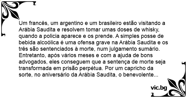 — Você é um de um país belíssimo, do futebol e das mulatas. Eu adoro o Brasil, e vou lhe agraciar com 2 pedidos antes da punição. - Obrigado, sua Alteza, disse o Brasileiro. Em reconhecimento a sua bondade, meu primeiro desejo é que eu receba 100 chibatadas e não 20 como previsto, pois eu me sinto culpado pelo ocorrido. Ao que o Sheik respondeu: