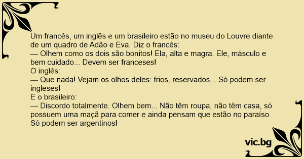 Um francês, um inglês e um brasileiro estão no museu do Louvre diante de um quadro de Adão e Eva. Diz o francês: