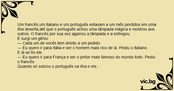 Um francês,um italiano e um português estavam a um mês perdidos em uma ilha deserta,até que o português achou uma lâmpada mágica e mostrou aos outros. O francês por sua vez agarrou a lâmpada e a esfregou.