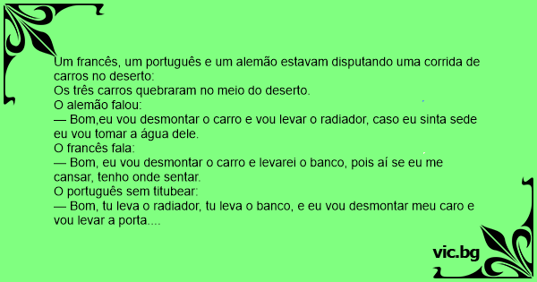 Um francês, um português e um alemão estavam disputando uma corrida de carros no deserto: