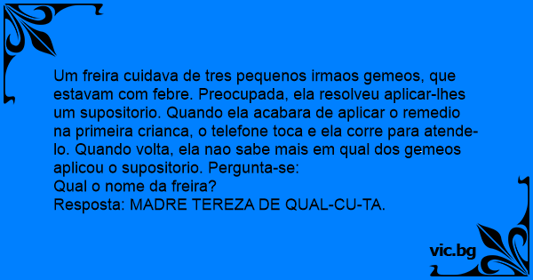 Um freira cuidava de tres pequenos irmaos gemeos, que estavam com febre. Preocupada, ela resolveu aplicar-lhes um supositorio. Quando ela acabara de aplicar o remedio na primeira crianca, o telefone toca e ela corre para atende-lo. Quando volta, ela nao sabe mais em qual dos gemeos aplicou o supositorio. Pergunta-se: