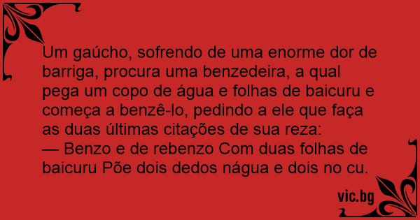 Um gaúcho, sofrendo de uma enorme dor de barriga, procura uma benzedeira, a qual pega um copo de água e folhas de baicuru e começa a benzê-lo, pedindo a ele que faça as duas últimas citações de sua reza: