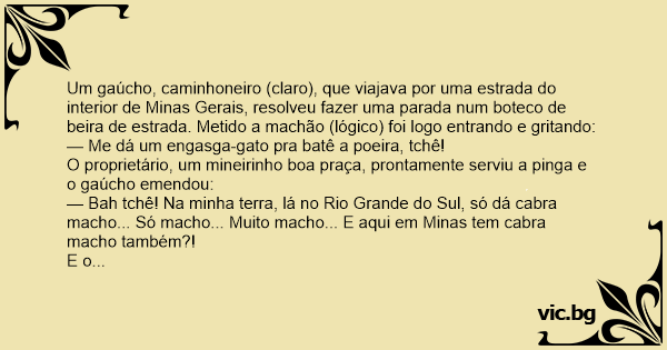 — Bah tchê! Na minha terra, lá no Rio Grande do Sul, só dá cabra macho... Só macho... Muito macho... E aqui em Minas tem cabra macho também?!