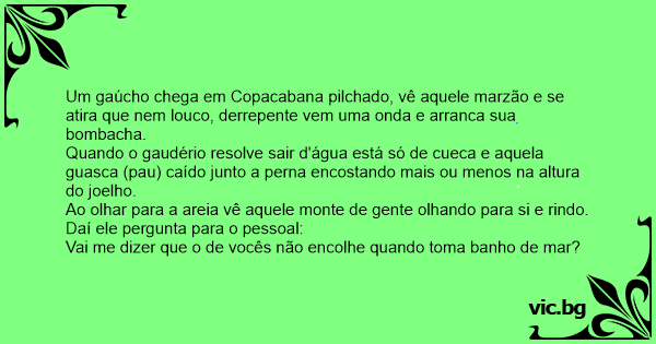 Um gaúcho chega em Copacabana pilchado, vê aquele marzão e se atira que nem louco, derrepente vem uma onda e arranca sua bombacha.