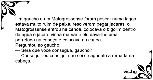 Um gaúcho e um Matogrossense foram pescar numa lagoa, estava muito ruim de peixe, resolveram pegar jacarés, o Matogrossense entrou na canoa, colocava o bigolim dentro da água o jacaré vinha mamar e ele dava-lhe uma porretada na cabeça e colocava na canoa.