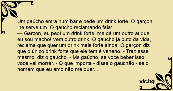— Garçon, eu pedí um drink forte, me dá um outro aí que eu sou macho! Vem outro drink. O gaúcho já рuто da vida, reclama que quer um drink mais forte ainda. O garçon diz que o único drink forte que ele tem é veneno. - Traz esse mesmo, diz o gaúcho. - Ms gaúcho, se voce beber isso voce vai morrer. - O que importa - disse o gauchão - se o homem que eu amo não me quer....