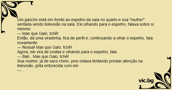 Um gaúcho está em frente ao espelho da sala no quarto e sua "mulher" sentada vendo televisão na sala. Ele,olhando para o espelho, falava sobre si mesmo: