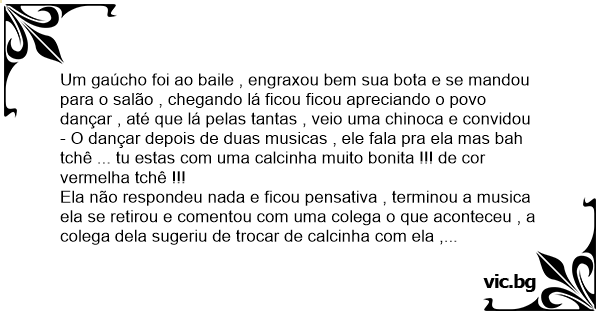 Um gaúcho foi ao baile , engraxou bem sua bota e se mandou para o salão , chegando lá ficou ficou apreciando o povo dançar , até que lá pelas tantas , veio uma chinoca e convidou - O dançar depois de duas musicas , ele fala pra ela mas bah tchê ... tu estas com uma calcinha muito bonita !!! de cor vermelha tchê !!!