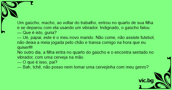 Um gaúcho, macho, ao voltar do trabalho, entrou no quarto de sua filha e se deparou com ela usando um vibrador. Indignado, o gaúcho falou: