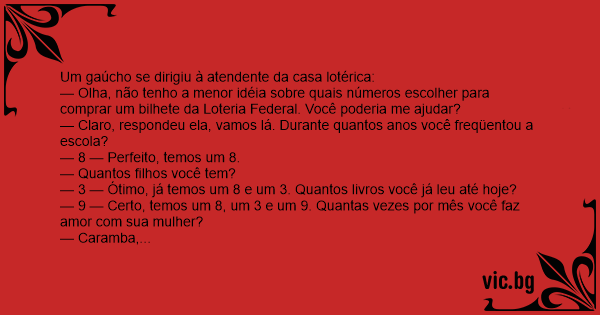 — Olha, não tenho a menor idéia sobre quais números escolher para comprar um bilhete da Loteria Federal. Você poderia me ajudar?
