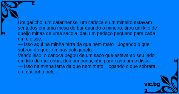 Um gaúcho, um catarinense, um carioca e um mineiro estavam sentados em uma mesa de bar quando o mineiro, tirou um kilo de queijo minas de uma sacola, deu um pedaço pequeno para cada um e disse: