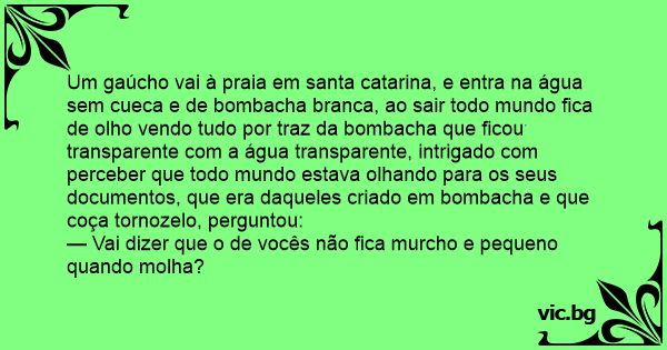 Um gaúcho vai à praia em santa catarina, e entra na água sem cueca e de bombacha branca, ao sair todo mundo fiса de olho vendo tudo por traz da bombacha que ficou transparente com a água transparente, intrigado com perceber que todo mundo estava olhando para os seus documentos, que era daqueles criado em bombacha e que coça tornozelo, perguntou: