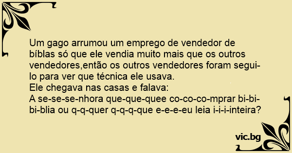 Um gago arrumou um emprego de vendedor de bíblas só que ele vendia muito mais que os outros vendedores,então os outros vendedores foram segui-lo para ver que técnica ele usava.