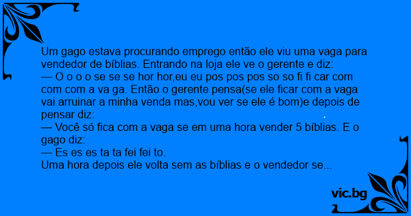 Um gago estava procurando emprego então ele viu uma vaga para vendedor de bíblias. Entrando na loja ele ve o gerente e diz: