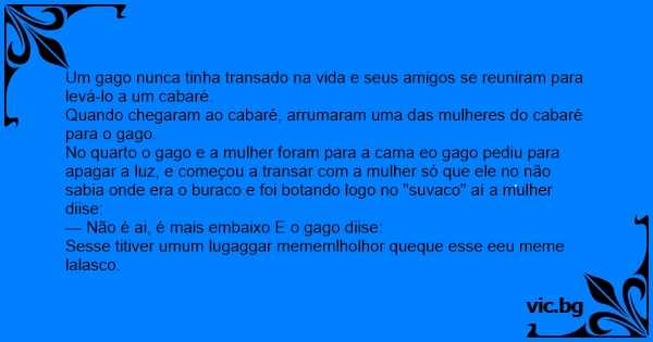 No quarto o gago e a mulher foram para a cama eo gago pediu para apagar a luz, e começou a transar com a mulher só que ele no não sabia onde era o buraco e foi botando logo no "suvaco" aí a mulher diise: