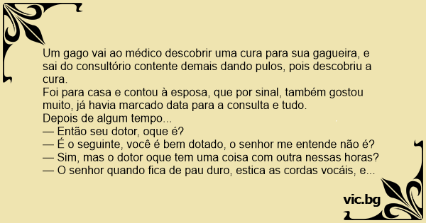 Um gago vai ao médico descobrir uma cura para sua gagueira, e sai do consultório contente demais dando pulos, pois descobriu a cura.