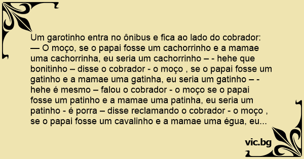 — O moço, se o papai fosse um cachorrinho e a mamae uma cachorrinha, eu seria um cachorrinho – - hehe que bonitinho – disse o cobrador - o moço , se o papai fosse um gatinho e a mamae uma gatinha, eu seria um gatinho – - hehe é mesmo – falou o cobrador - o moço se o papai fosse um patinho e a mamae uma patinha, eu seria um patinho - é роrrа – disse reclamando o cobrador - o moço , se o papai fosse um cavalinho e a mamae uma égua, eu seria um cavalinho não aguentando mais o cobrador soltou o verbo: