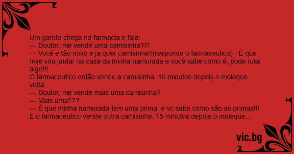 O farmaceutico então vende a camisinha. 10 minutos depois o moleque volta: