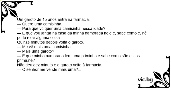 Um jovem de 16 anos chega em uma farmácia e diz: — Eu quero uma camisinha. sabe como é né, vo janta na casa da minha namorada.. quer dizer, me vê mais uma ai moço, sabe como é.. ela tem uma irmã...