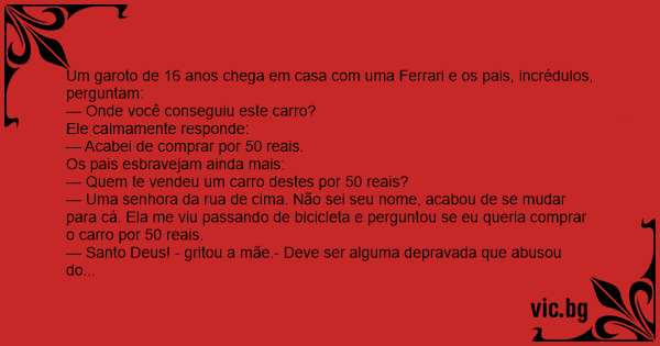 Um garoto de 16 anos chega em casa com uma Ferrari e os pais, incrédulos, perguntam: