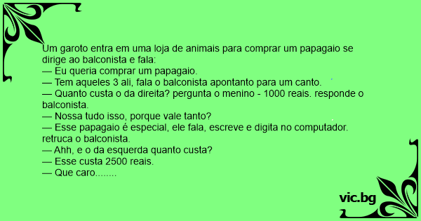 Um homem entra em uma loja de animais querendo comprar um papagaio. Nessa loja haviam somente 3 papagaios e o homem pergunta: — Quanto custa esse papagaio? E o vendedor responde: — Mil reais. O...