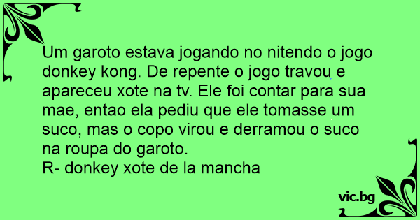 Um garoto estava jogando no nitendo o jogo donkey kong. De repente o jogo travou e apareceu xote na tv. Ele foi contar para sua mae, entao ela pediu que ele tomasse um suco, mas o copo virou e derramou o suco na roupa do garoto.