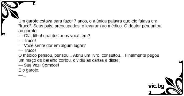 Um garoto estava para fazer 7 anos, e a única palavra que ele falava era "truco". Seus pais, preocupados, o levaram ao médico. O doutor perguntou ao garoto: