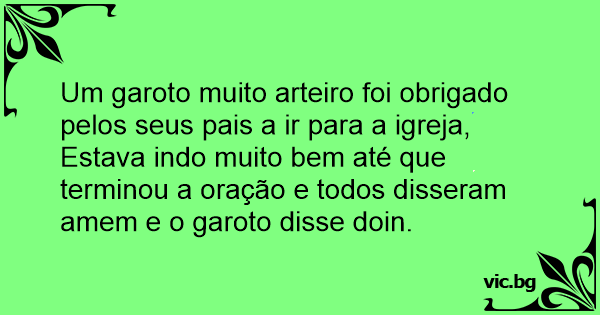 Um garoto muito arteiro foi obrigado pelos seus pais a ir para a igreja, Estava indo muito bem até que terminou a oração e todos disseram amem e o garoto disse doin.
