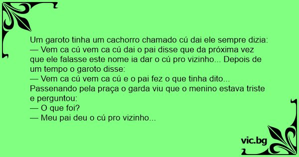— Vem ca cú vem ca cú dai o pai disse que da próxima vez que ele falasse este nome ia dar o cú pro vizinho... Depois de um tempo o garoto disse: