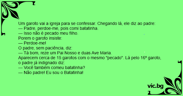 Um garoto vai a igreja para se confessar. Chegando lá, ele diz ao padre: