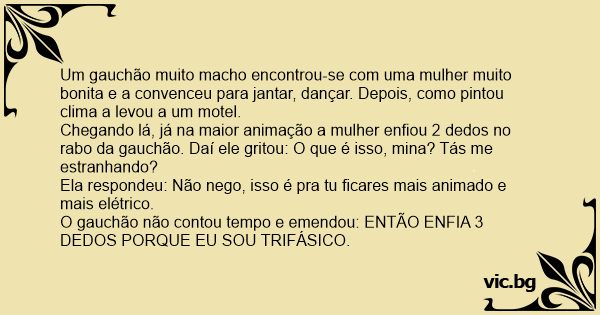 O gauchão não contou tempo e emendou: ENTÃO ENFIA 3 DEDOS PORQUE EU SOU TRIFÁSICO.