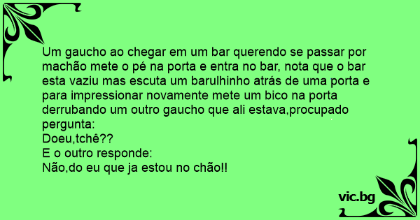 Um gaucho ao chegar em um bar querendo se passar por machão mete o pé na porta e entra no bar, nota que o bar esta vaziu mas escuta um barulhinho atrás de uma porta e para impressionar novamente mete um bico na porta derrubando um outro gaucho que ali estava,procupado pergunta: