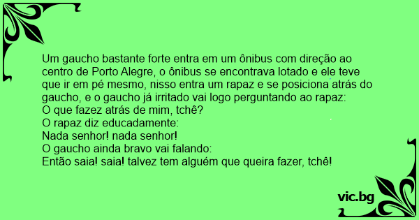 Um gaucho bastante forte entra em um ônibus com direção ao centro de Porto Alegre, o ônibus se encontrava lotado e ele teve que ir em pé mesmo, nisso entra um rapaz e se posiciona atrás do gaucho, e o gaucho já irritado vai logo perguntando ao rapaz: