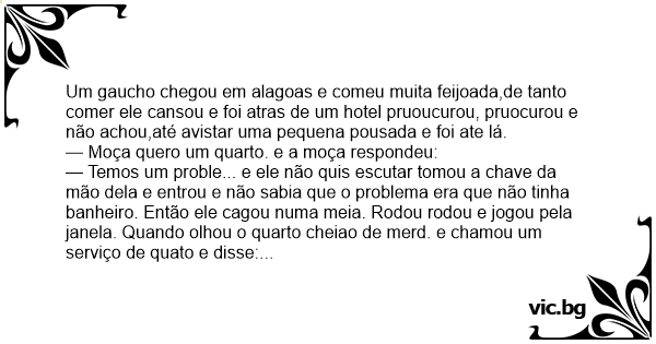 Um gaucho chegou em alagoas e comeu muita feijoada,de tanto comer ele cansou e foi atras de um hotel pruoucurou, pruocurou e não achou,até avistar uma pequena pousada e foi ate lá.