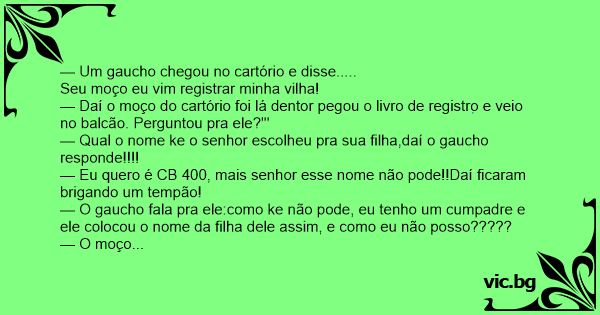 — O gaucho fala pra ele:como ke não pode, eu tenho um cumpadre e ele colocou o nome da filha dele assim, e como eu não posso?????