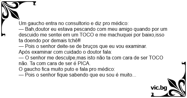 — Tá bom doutor_responde o gaucho_me de então um remédio pra РIСА mais que foi TOCO foi,bah!!!!!!