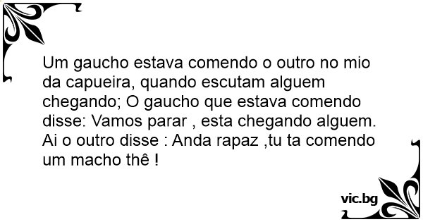 Um gaucho estava comendo o outro no mio da capueira, quando escutam alguem chegando; O gaucho que estava comendo disse: Vamos parar , esta chegando alguem. Ai o outro disse : Anda rapaz ,tu ta comendo um macho thê !