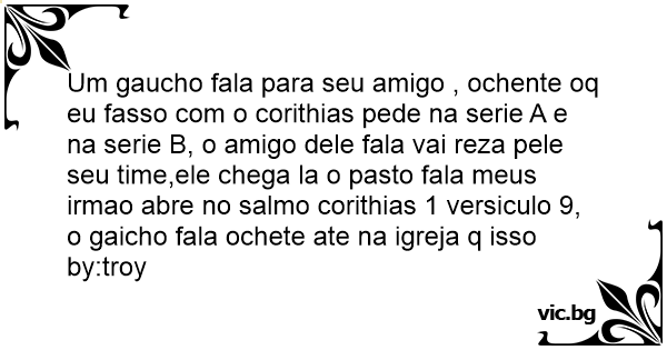 Um gaucho fala para seu amigo , ochente oq eu fasso com o corithias pede na serie A e na serie B, o amigo dele fala vai reza pele seu time,ele chega la o pasto fala meus irmao abre no salmo corithias 1 versiculo 9, o gaicho fala ochete ate na igreja q isso by:troy