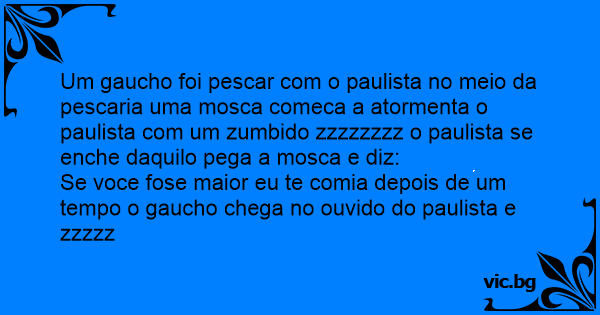 Um gaucho foi pescar com o paulista no meio da pescaria uma mosca comeca a atormenta o paulista com um zumbido zzzzzzzz o paulista se enche daquilo pega a mosca e diz: