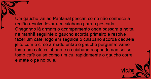 Um gaucho vai ao Pantanal pescar, como não conhece a região resolve levar um cuiabano para a pescaria. Chegando lá armam o acampamento onde passam a noite, na manhã seguinte o gaucho acorda primeiro e resolve fazer um café, logo em seguida o cuiabano acorda daquele jeito com o circo armado então o gaucho pergunta: vamo toma um café cuiabano e o cuiabano responde não sei se tomo café ou se como um cú, rapidamente o gaucho corre e mete o pé no bule.