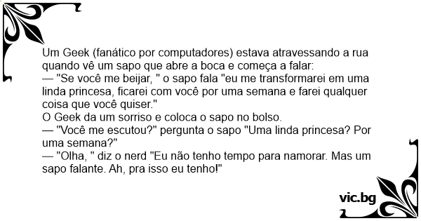 — "Olha, " diz o nerd "Eu não tenho tempo para namorar. Mas um sapo falante. Ah, pra isso eu tenho!"