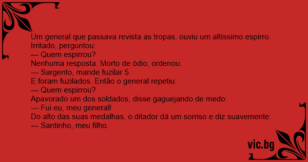 Um general que passava revista as tropas, ouviu um altíssimo espirro. Irritado, perguntou: