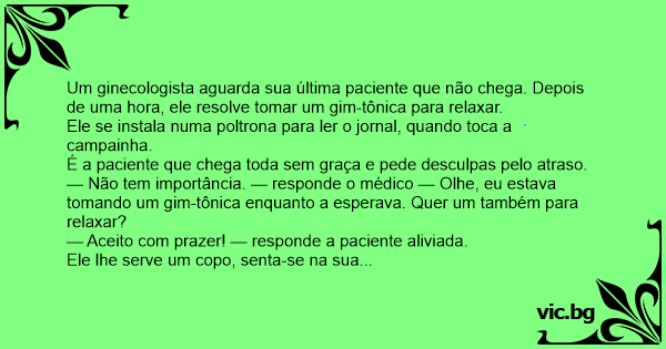 Um ginecologista aguarda sua última paciente que não chega. Depois de uma hоrа, ele resolve tomar um gim-tônica para relaxar.