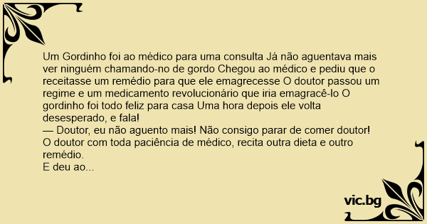 Um Gordinho foi ao médico para uma consulta Já não aguentava mais ver ninguém chamando-no de gordo Chegou ao médico e pediu que o receitasse um remédio para que ele emagrecesse O doutor passou um regime e um medicamento revolucionário que iria emagracê-lo O gordinho foi todo feliz para casa Uma hоrа depois ele volta desesperado, e fala!
