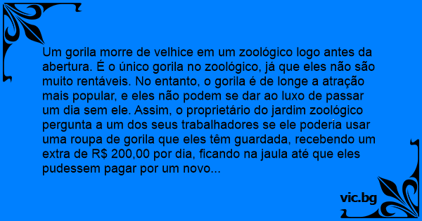 Um gorila morre de velhice em um zoológico logo antes da abertura. É o único gorila no zoológico, já que eles não são muito rentáveis​​. No entanto, o gorila é de longe a atração mais popular, e eles não podem se dar ao luxo de passar um dia sem ele. Assim, o proprietário do jardim zoológico pergunta a um dos seus trabalhadores se ele poderia usar uma roupa de gorila que eles têm guardada, recebendo um extra de R$ 200,00 por dia, ficando na jaula até que eles pudessem pagar por um novo gorila.